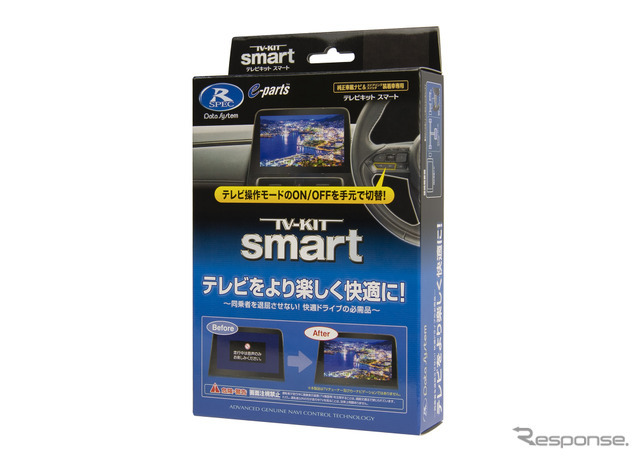 切り替えタイプにはTV-KIT機能をオン/オフできる小型スイッチが付属。車種専用設計で、設置・接続は完全カプラーオンなので、配線の切断や加工は一切不要となっている。スマートタイプでは純正ステアリングスイッチの操作によりテレビ視聴機能のオン/オフに対応する。