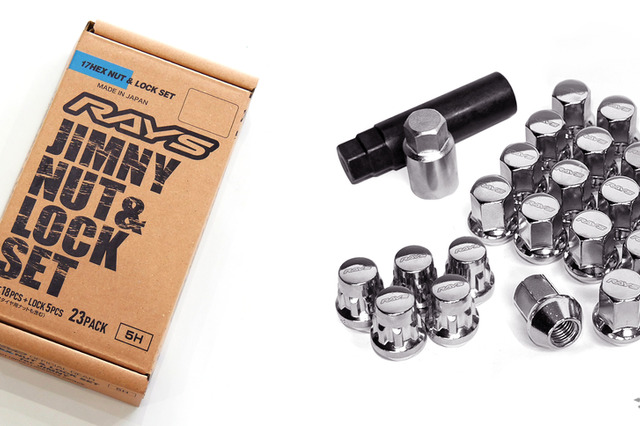ホイールを換えたからにはナットにもこだわりたいというユーザーの要望に応えてJIMNY専用17HEXナット&ロックセットもクローム/ブラックが用意されている。このセットの注目ポイントとしてホイール4本分はもちろんの事、背面のスペアタイヤ用ナット3個までセットになっている“かゆいところに手が届く”アイテムだ。見落としがちな部分までもドレスアップに無駄なくこだわれる最適なセットなのでぜひ同時に導入して欲しい。