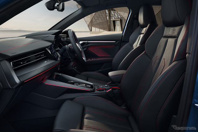 S line plusパッケージとして、レッドステッチを施したブラックのレザー/アーティフィシャルレザー製S lineシート、プライバシーガラス、アウディ ドライブセレクトを装備。MMIナビゲーションシステム、バーチャルコックピットプラス、アウディ サウンドシステムで構成されるナビゲーションパッケージも採用する。さらに電動調整機能付きフロントシート、アドバンストキーシステム、シートヒーターフロント、パークアシストプラス、サラウンドビューカメラ、アダプティブクルーズアシスト/エマージェンシーアシストなどを含むコンビニエンス&アシスタンスパッケージを標準装備する。特別装備のアンビエントライティングプロが室内を彩る。