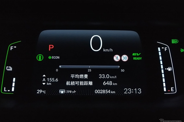 一方、実測燃費は好成績を残した。東京東部ですり切り満タンにした後、関越自動車道、国道254号から霧ヶ峰まで駆け上がり、そこから標高約300mの山梨の竜王まで下ったところまでの299.1km区間が26.2km/リットル(燃費計値26.5km/リットル)、そこから甲府盆地一円を周遊した後に一般道のみで東京東部に達し、和光市に戻る途中までの180.0km区間が32.1km/リットル(燃費計値33.0km/リットル)。参考までに、満タン法計測を行っていない渋滞含みの都市走行オンリーでの平均燃費計値は25km/リットル台だった。