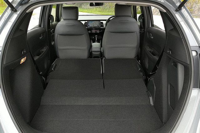 第4世代フィットは元々ユーティリティについてはBセグメントハッチバックのトップランナー。前席は圧迫感が小さく、収納スペースが充実しており居住感、使い勝手とも良好。後席は広く、座面が前席に対して十分に高く取られ、開放感が高い。荷室はe:HEVの場合、床下にハイブリッドシステムを詰め込んだため超広大な純ガソリン版に比べると狭いが、それでも絶対的にはクラストップレベルだ。