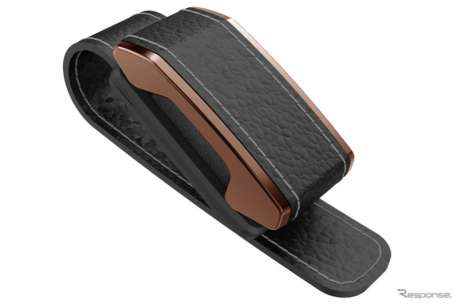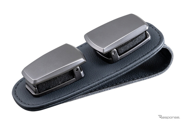 続いては「SEIWA(セイワ)」の新作、『レザー調ツインサングラスクリップ(WA182)』(価格:オープン、実勢価格:1680円前後)をフィーチャーする。当品も車両のサンバイザーに装着するサングラスクリップなのだが、こちらは2個を同時に収納できることがストロングポイントだ。眩しさの程度によりサングラスを使い分けているのならこちらが向く。