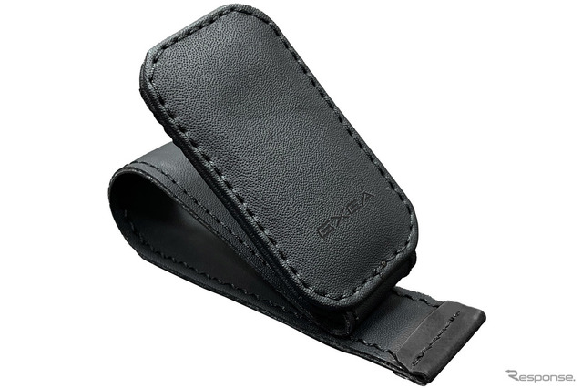 もう1つEXEAの新作をお見せしよう。それはこちら『レザーサングラスホルダー(EC-261)』(価格:オープン、実勢価格:970円前後)だ。当品もサンバイザーに装着して使用するサングラスホルダーだ。で、こちらも本革調の生地+リアルステッチにてシックに仕上げられている。ただしメッキはあしらわれていないので、よりシンプルな佇まい。主張が控えめなのでその分、インテリアと自然になじむ。