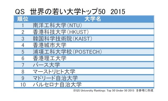 世界大学評価機関の英国クアクアレリ・シモンズ(Quacquarelli Symonds、以下QS)は11月25日、世界の創立50年未満の優良大学を評価するランキング「2015 QS Top 50 under 50(世界の若い大学ランキング)」を発表した。