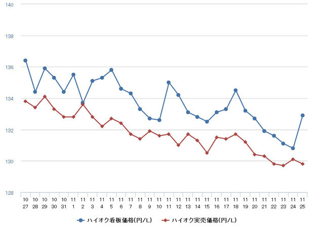 資源エネルギー庁が11月26日に発表した石油製品の店頭小売価格週次調査によると、11月24日時点でのレギュラーガソリンの全国平均価格は前週の調査から1.3円値下がりし、1リットル当たり130.3円となった。