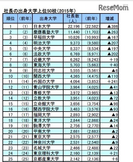 帝国データバンクは、「2016年全国社長分析」を公表した。社長の出身大学のトップ10は前年度と同様で1位は日本大学、2位は慶應義塾大学だった。また、外国の大学出身の社長が前年度より200人以上増えていることがわかった。