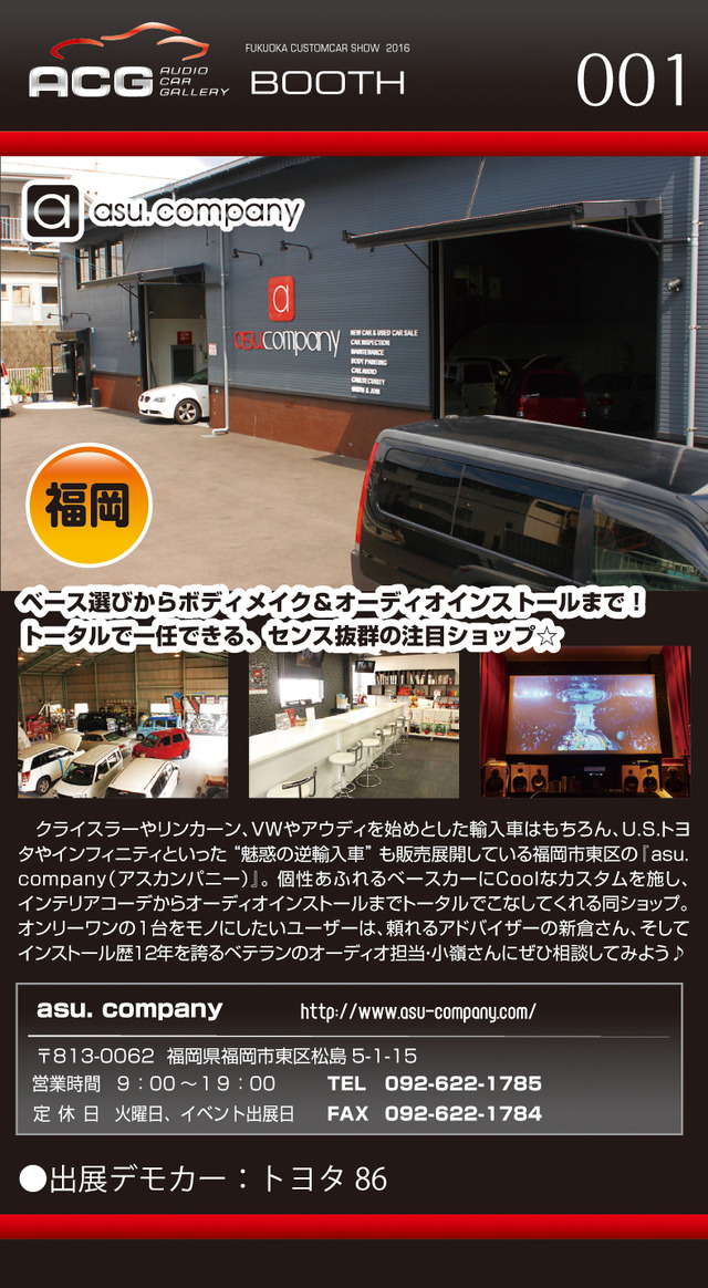 2月20日(土)~2月21日(日)の2日間に渡って、福岡ヤフオク!ドームで開催される『福岡カスタムカーショー2016』。今年も昨年同様、魅せて聴かせる本格カスタムオーディオエリア、【ACG(オーディオカーギャラリー)ブース】が出展される。