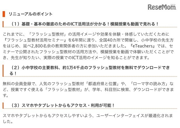 チエルら「フラッシュ型教材活用実践プロジェクト」が展開する、小中学校の先生を中心とした教育関係者向けの「フラッシュ型教材」ダウンロードサイト「eTeachers(イーティーチャーズ)」は、10月6日にサイトをリニューアルした。