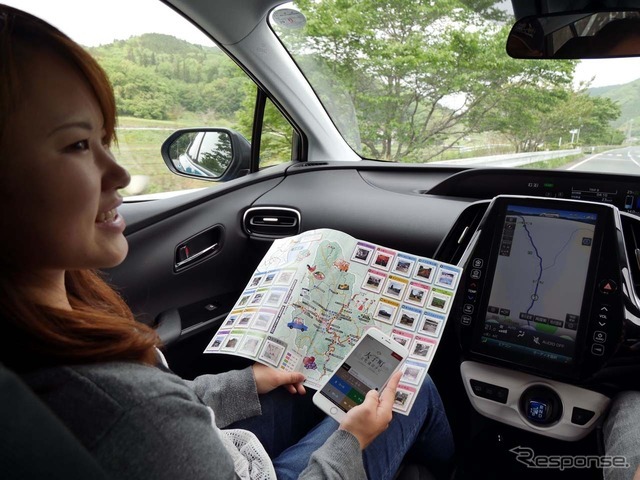 《PHOTO:会田肇》 今回の取材で大活躍したアプリの「大子町ドライブマップ」と「大子町文化遺産ナビ」。プリウスPHVに搭載ナビともスムーズに連携できた