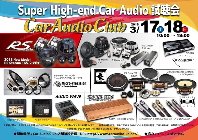 3月17日(土)と18日(日)の2日間、大阪府高槻市のプロショップ「カーオーディオクラブ」店舗特設会場にて、世界トップクラスのスーパーハイエンドユニットを集めた『Super High-end Car Audio試聴会』が開催される。