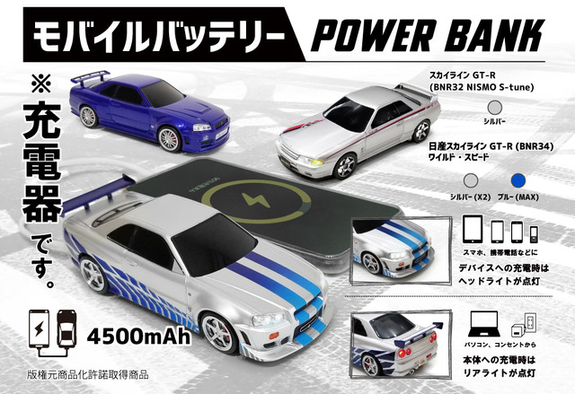 車型ギフト商品を販売するCAMSHOP.JP(株式会社フェイス運営)から、自動車型モバイルバッテリー「NISSANスカイライン GT-R(BNR32 NISMO S-tune)」の販売が開始された。日産自動車(株)公認のライセンス商品となっている。