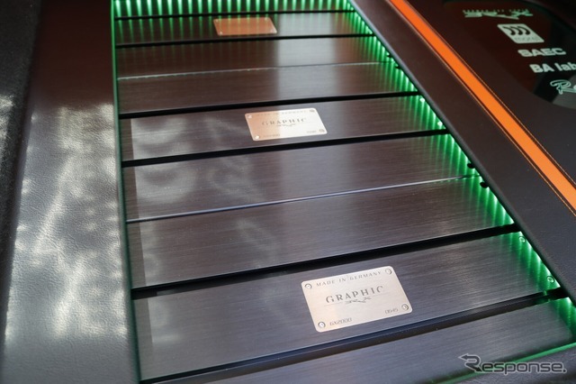 パワーアンプにはブラックスのグラフィックGX2000とGX2400を用いる。同サイズ×3台のアンプが並ぶスタイルが美しい。