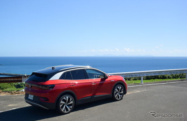 ID.4のリアビュー。赤色は高輝度のマイカ塗装で、海とのコントラストが映えた。