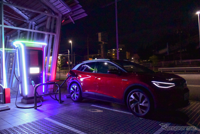 《写真撮影 井元康一郎》 アウディディーラーの150kW機で充電中。全国の主要都市を広くカバーしているため心強い。