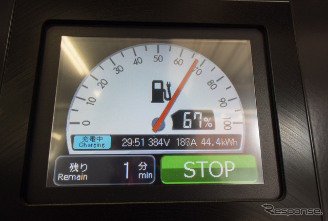 《写真撮影 井元康一郎》 30分の投入電力量は44.5kWh。ハイスピードクルーズでなければ航続300km前後を期待できる。