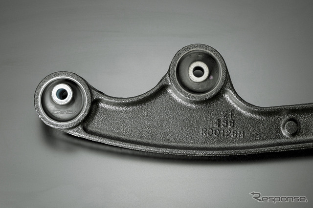 《写真提供 SPK》 わずか20ミリのリフト量でマイナス領域まで減少してしまうキャスター角。リーディングアーム前側のブッシュを交換することで適切なポジションへ矯正。