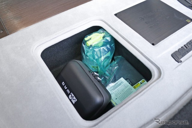 ラゲッジの一部には収納スペースを備えるのも印象的。パンク修理キット用のスペースは絶対に欲しかったという。