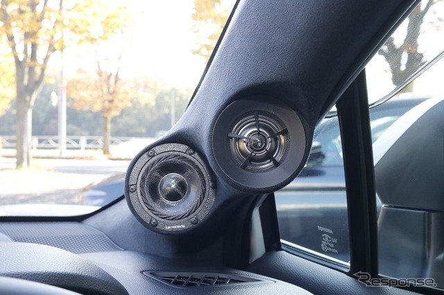 AピラーにはカロッツェリアのRSスピーカーのツイーター/ミッドレンジをインストール。デザイン性と高音質を両立した。
