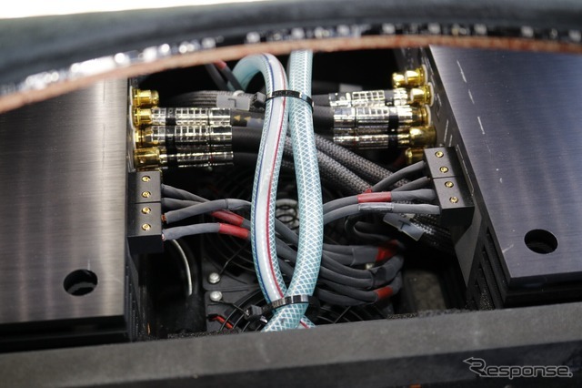 オーディオボードをわずかに持ち上げて内部を見ると水冷システムの配管が見える。温度管理を徹底して安定した高音質を再生する。