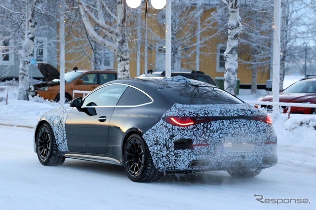 スクープ班のカメラが、メルセデスベンツ『CLE』のフェイスリフト版が雪道テスト走行中の姿を捉えた。前回の遭遇は標準モデルだったが、今回は、より高出力なパワーと、アグレッシブなスタイリングを持つメルセデスAMG 「CLE63」と思われる。