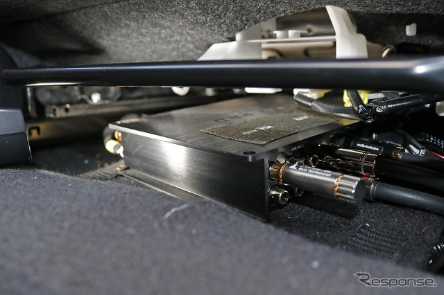 シート下のわずかなスペースを利用して取り付けられているのがヘリックスのDSP PR MKIII。システムの司令塔的に役割を持つ。