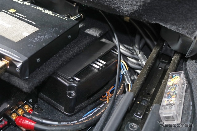 助手席下のDAC部分を見ると、積層して下段にパワーアンプが収められているのがわかる。こちらは4チャンネルモデル。