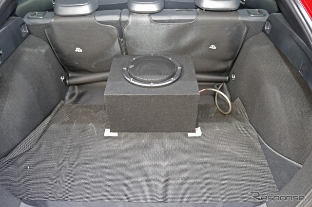 ラゲッジは積載スペースとして確保するため設置されているのはサブウーファーのみ。前方の中央にエンクロージャーを設置。
