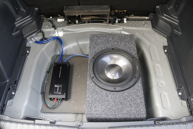 ラゲッジのフロアパネルを外すとフロア下からサブウーファーとパワーアンプが現れる、シンプルなレイアウトとした。