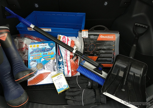 《写真撮影 井元康一郎》 スバル広報車の雪国セット。ラダー、ハンドワイパー、スコップ、タイヤソック、融雪剤、ジャンプスタート用ケーブル等々