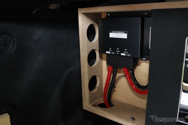 前面ウォール面にはパワーアンプのインストールに加えて、電源の強化パーツも設置。配線の取り回しなども考慮された作り。