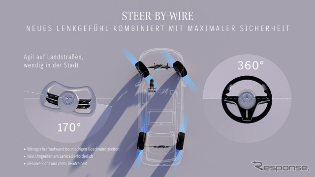 メルセデスベンツは、最上位EVセダンの『EQS』改良新型にステア・バイ・ワイヤ技術を採用すると発表した。プロトタイプの写真を公開している。